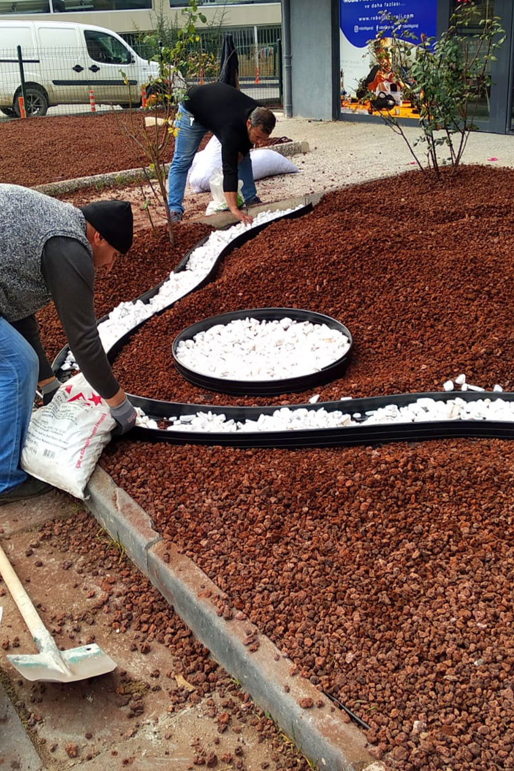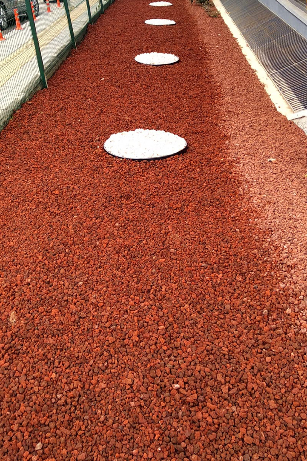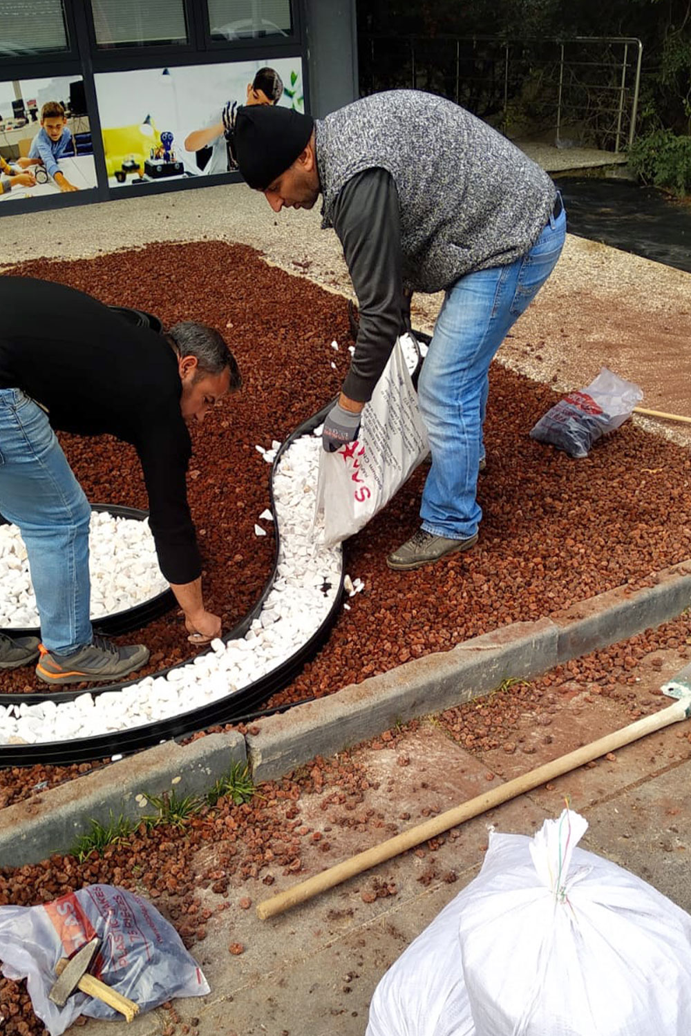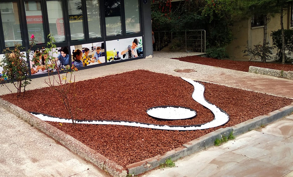 - Pomza (cüruf) ve dolamit taşı serilmesi: Jut serimi (sera örtüsü) yapıldıktan sonra peyzaj alanına son dokunuşlar yapılarak pomza ve dolamit taşı serilmiş ve kuru peyzaj çalışması eksiksiz bir şekilde tamamlanmıştır.