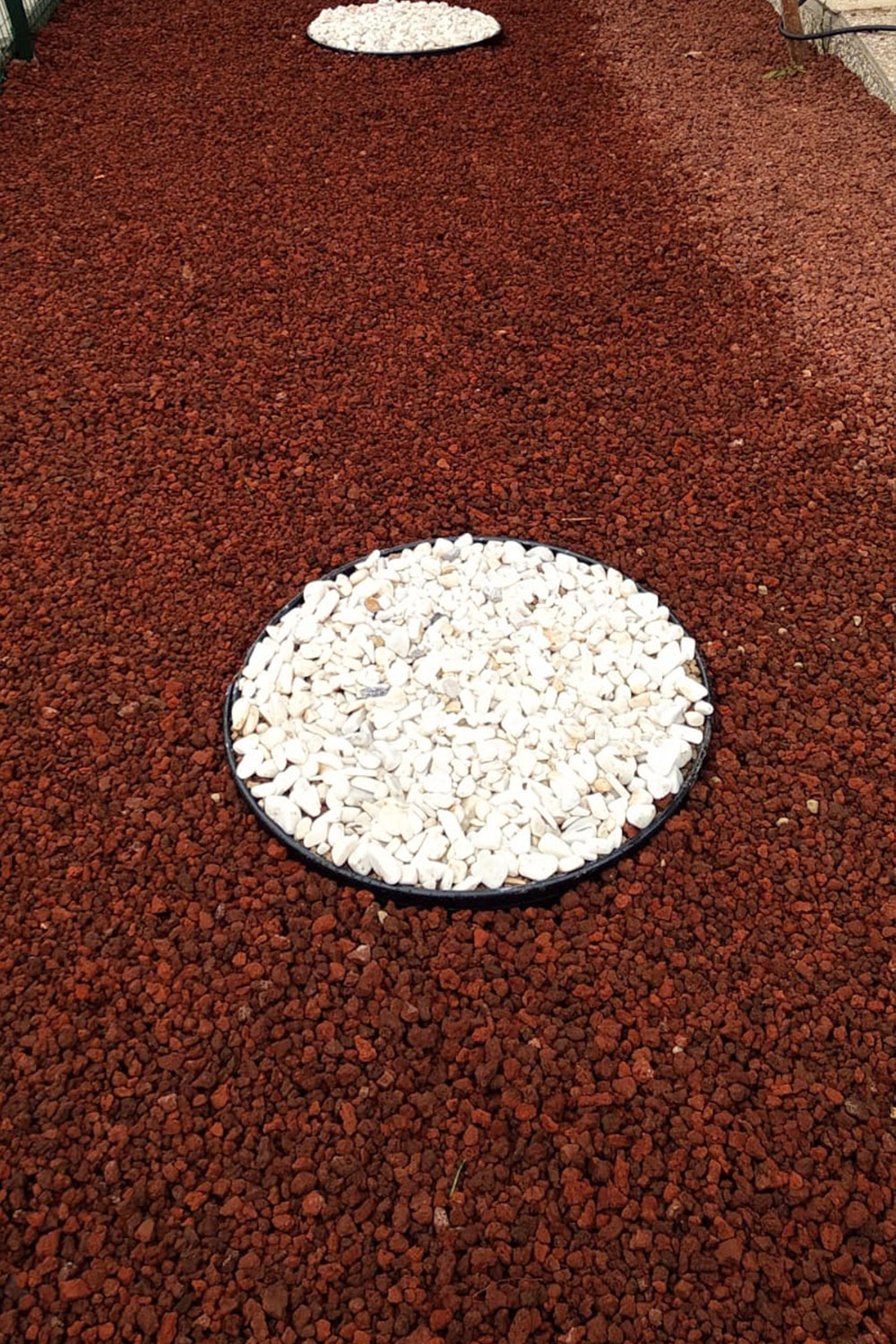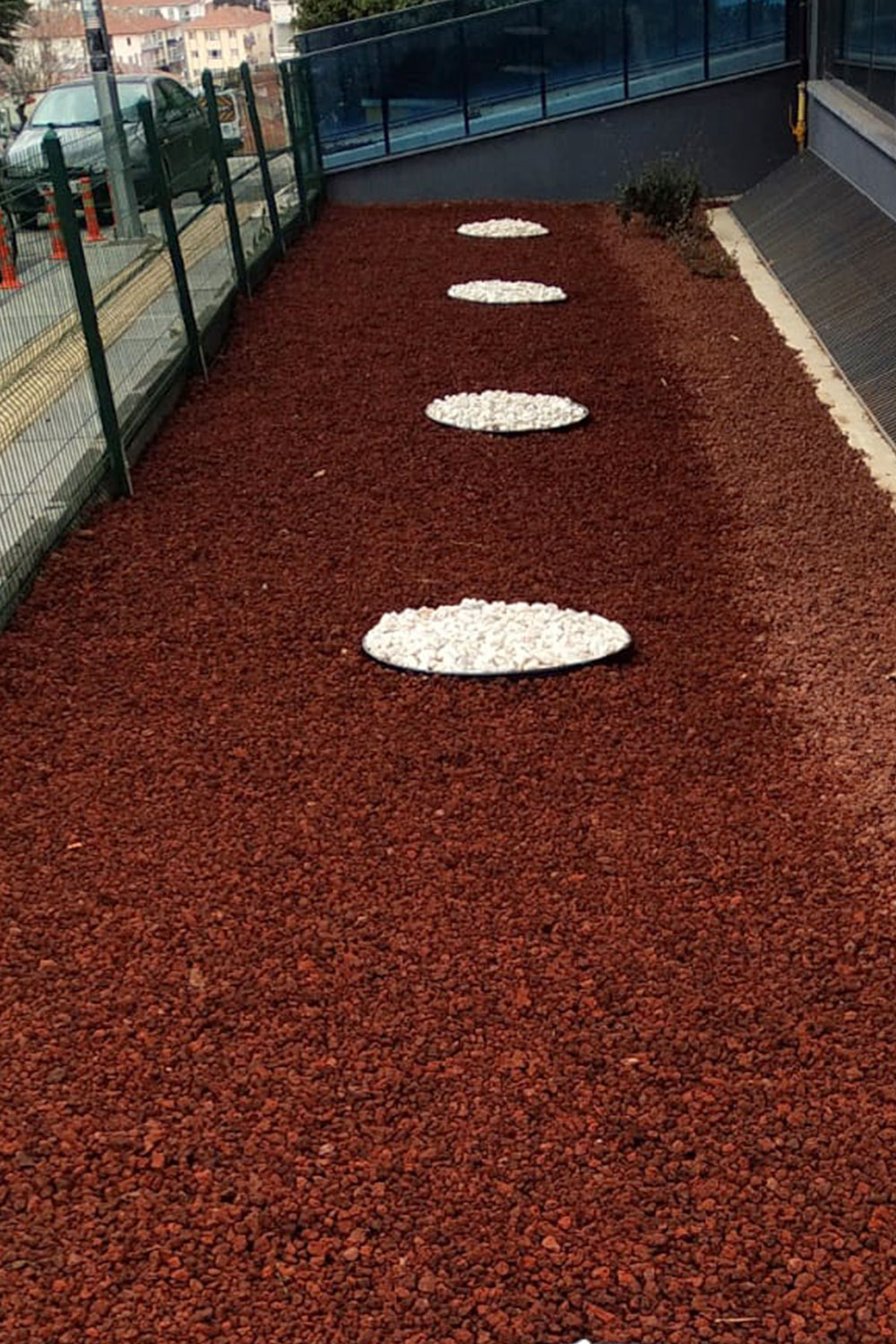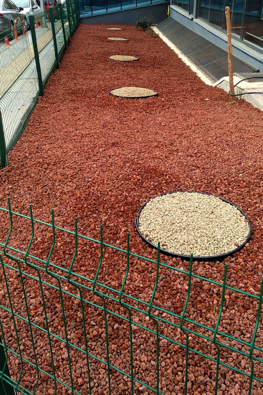 - Pomza (cüruf) ve dolamit taşı serilmesi: Jut serimi (sera örtüsü) yapıldıktan sonra peyzaj alanına son dokunuşlar yapılarak pomza ve dolamit taşı serilmiş ve kuru peyzaj çalışması eksiksiz bir şekilde tamamlanmıştır.