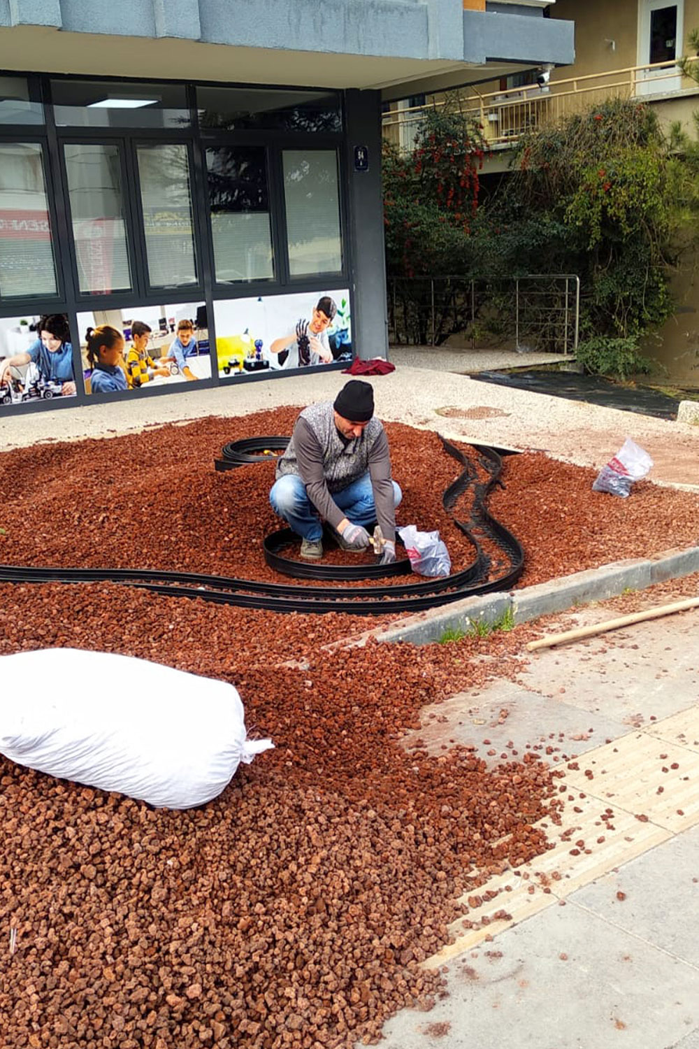 - Jut (sera örtüsü) serilmesi: Çim ayracı serilen peyzaj alanında yabani ot çıkışını engellemek amacıyla jut serimi gerçekleştirilmiştir.