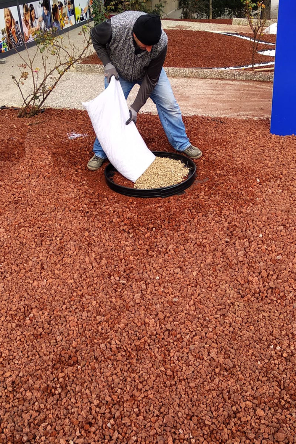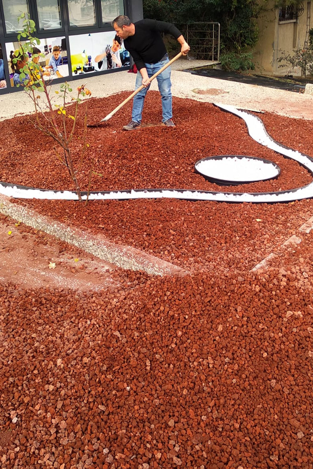 - Toprak hazırlığı: 150 m²’lik peyzaj alanında kullanılan pomza taşının (cüruf) sahaya homojen bir şekilde yayılmasını sağlamak için kot farkı minimum seviyeye indirilerek toprak tesviyesi yapılmıştır.